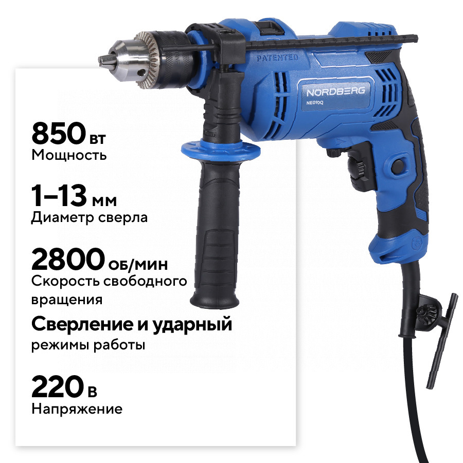 NORDBERG NE010Q — это надёжная и удобная в работе дрель, идеально подходящая как для домашних мастеров, так и для полупрофессионального применения, строительных и монтажных бригад.