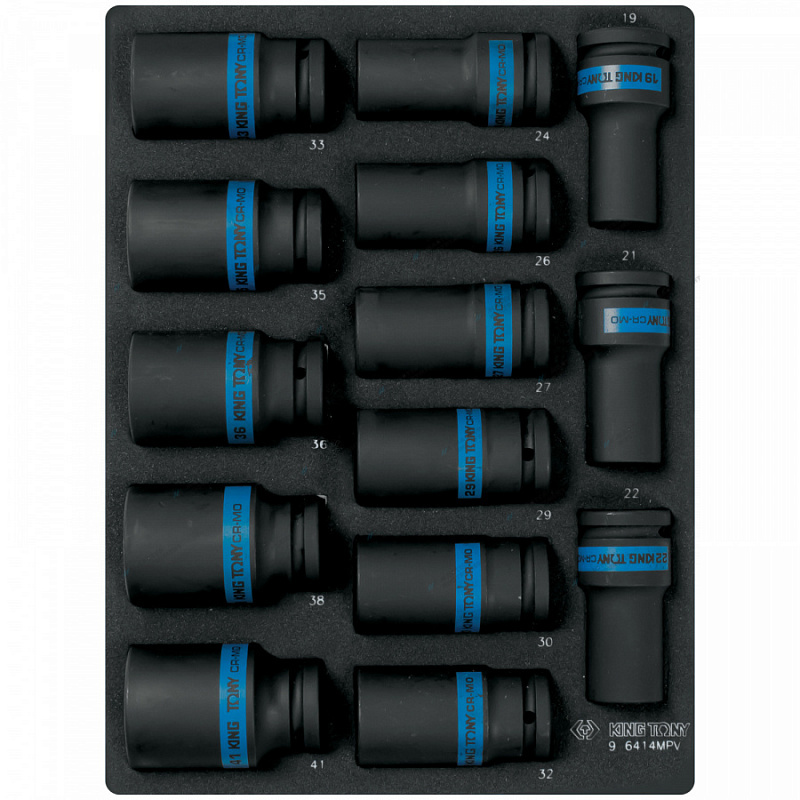 Набор ударных головок торговой марки KING TONY включает в себя ударные глубокие торцевые головки и предназначены для работы с пневматическим инструментом. Входящий в материал инструментов хром-молибденовый сплав придаёт особую прочность и стойкость к ударным нагрузкам.