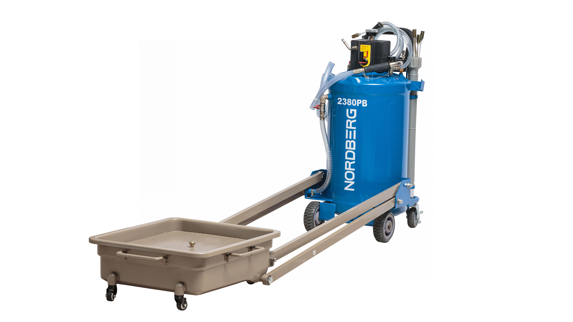 Установка для сбора масла с пантографом NORDBERG 2380PB стальная емкость объемом 80 л, лоток 48 л., на колесах для удобства перемещения в помещении автосервиса, Сбор масла осуществляется путем подключении внешнего компрессора (поставляется отдельно).