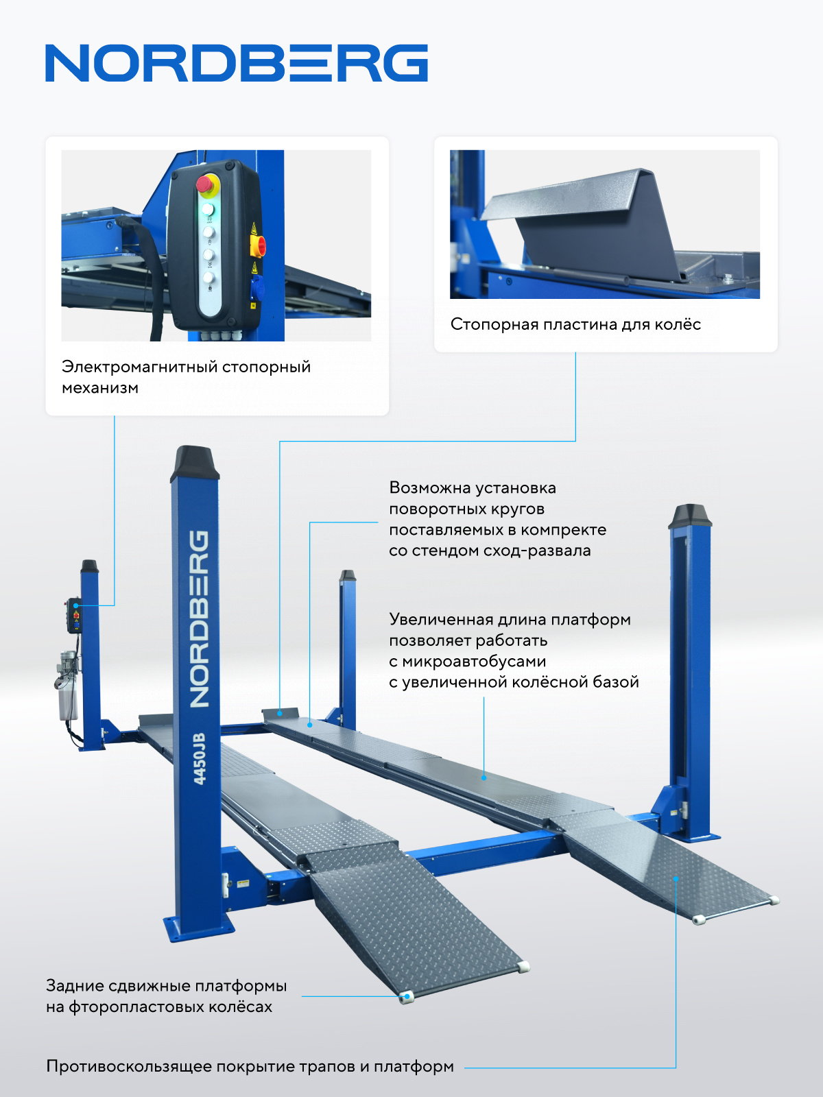 NORDBERG 4450J_EB — профессиональный четырёхстоечный подъёмник, сочетающий высокую грузоподъёмность, точность и безопасность. Оптимальное решение для автосервисов, где требуется эффективная и качественная работа с подвеской и ходовой частью.