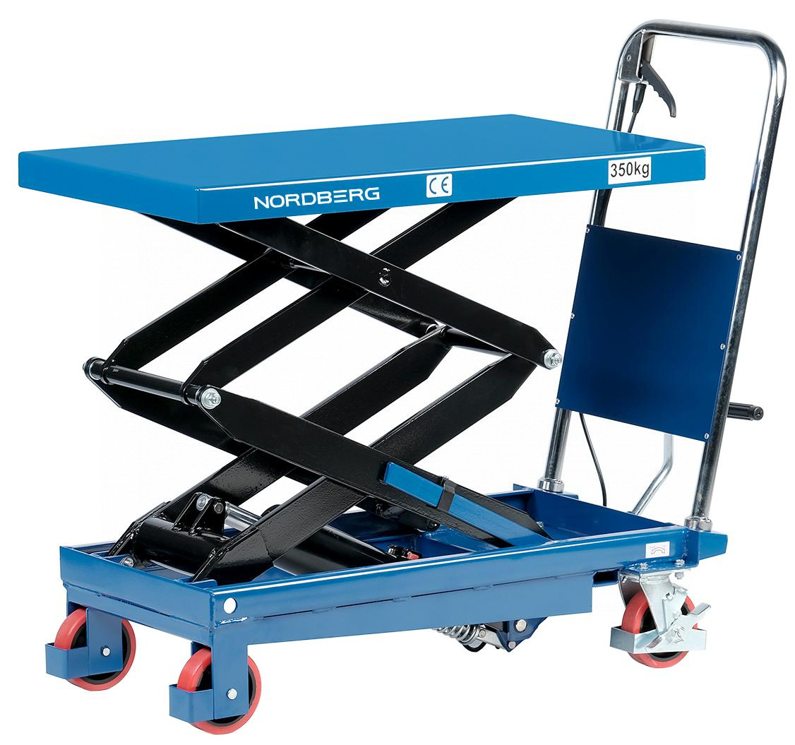 Подъемный гидравлический стол N3T350 предназначен для подъема, опускания и перемещения груза. Конструкция представляет собой совмещение платформенной тележки и стационарного подъемного стола. Подъемный стол имеет гидравлический ножной привод, который позволяет произвести быстрый подъем груза. Опускание производится путем нажатия рычага на ручке подъемного стола. Подъемный стол оснащен стопором, который позволяет надежно закрепить положение в поднятом состоянии. Гидравлическая система позволяет столу опускаться плавно, обеспечивая безопасность работ с грузами. Тележки с подъемным столом с ручным приводом мобильны, эффективны и надежны. Они позволяют не только приподнимать грузы, но и перемещать их на расстояния.