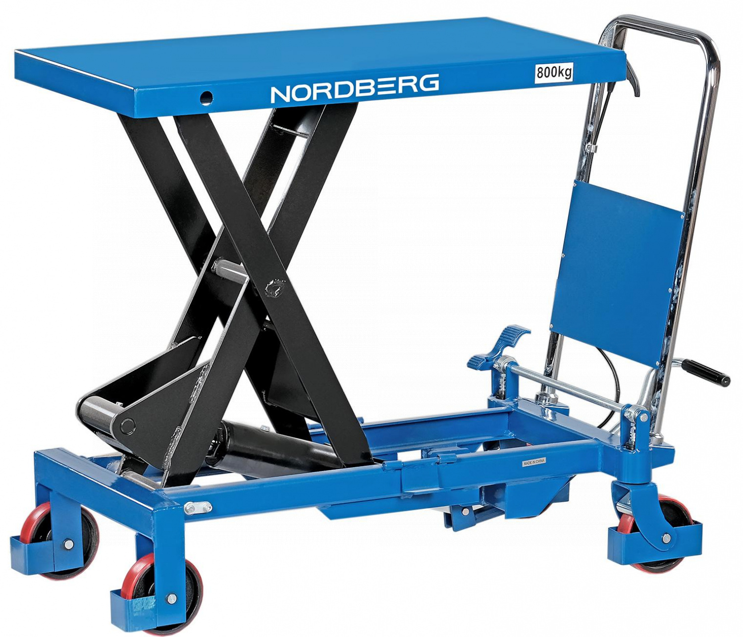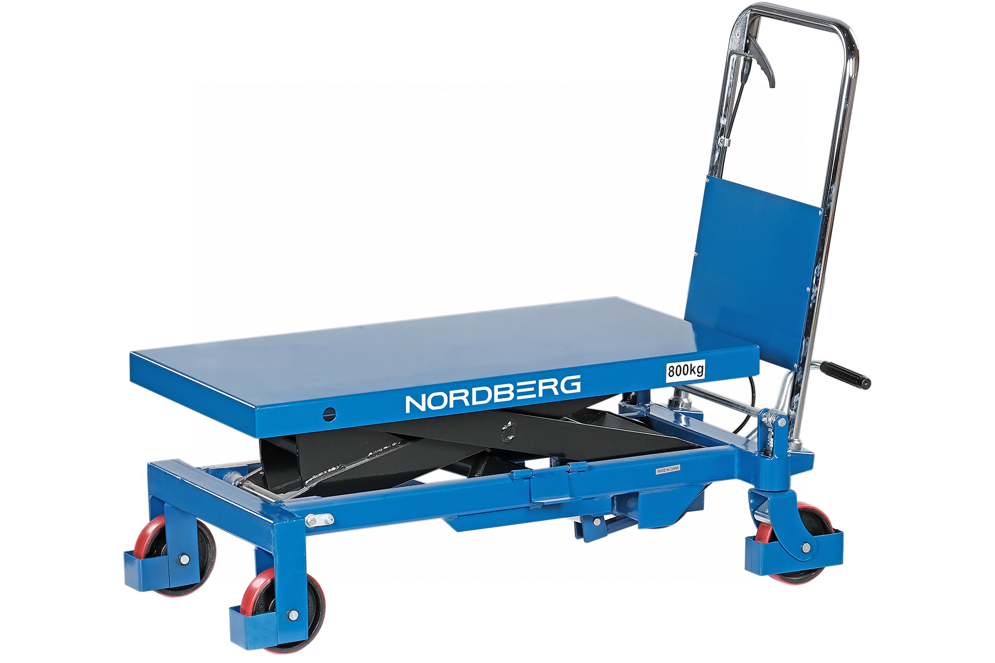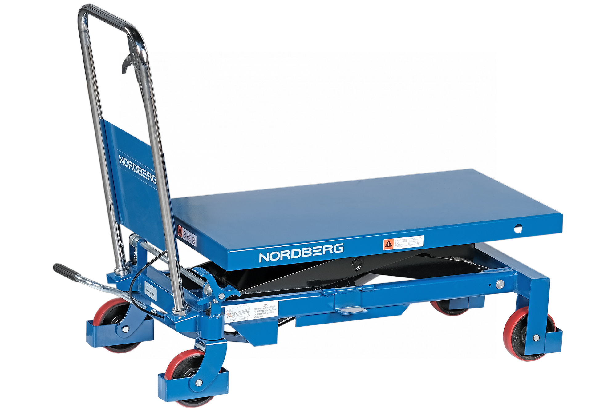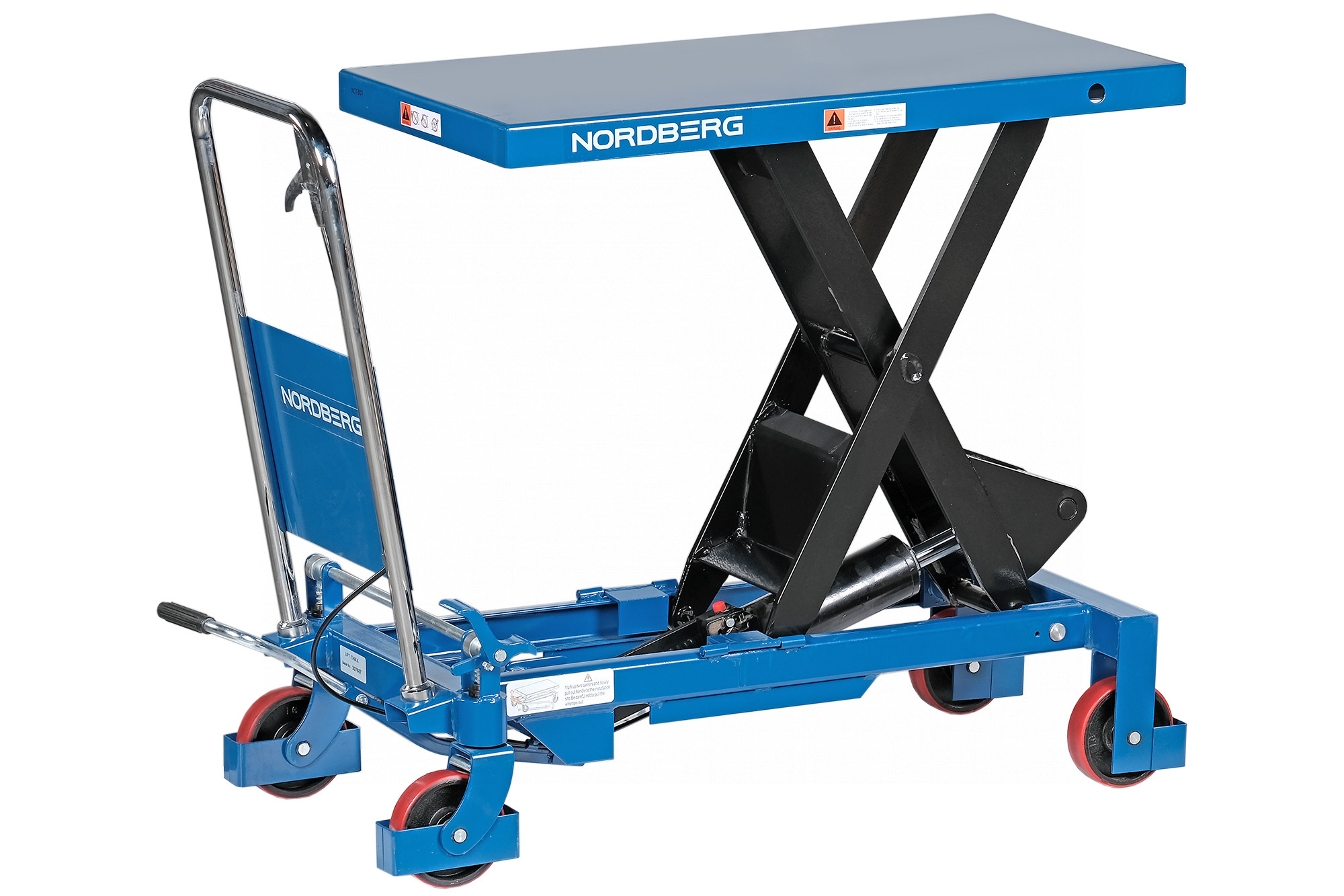 Стол подъемный гидравлический 800 кг NORDBERG N3T801 предназначен для подъема, опускания и перемещения груза. Конструкция представляет собой совмещение платформенной тележки и стационарного подъемного стола. Подъемный стол имеет гидравлический ножной привод, который позволяет произвести быстрый подъем груза. Опускание производится путем нажатия рычага на ручке подъемного стола. Подъемный стол оснащен стопором, который позволяет надежно закрепить положение в поднятом состоянии. Гидравлическая система позволяет столу опускаться плавно, обеспечивая безопасность работ с грузами. Тележки с подъемным столом с ручным приводом мобильны, эффективны и надежны. Они позволяют не только приподнимать грузы, но и перемещать их на расстояния.