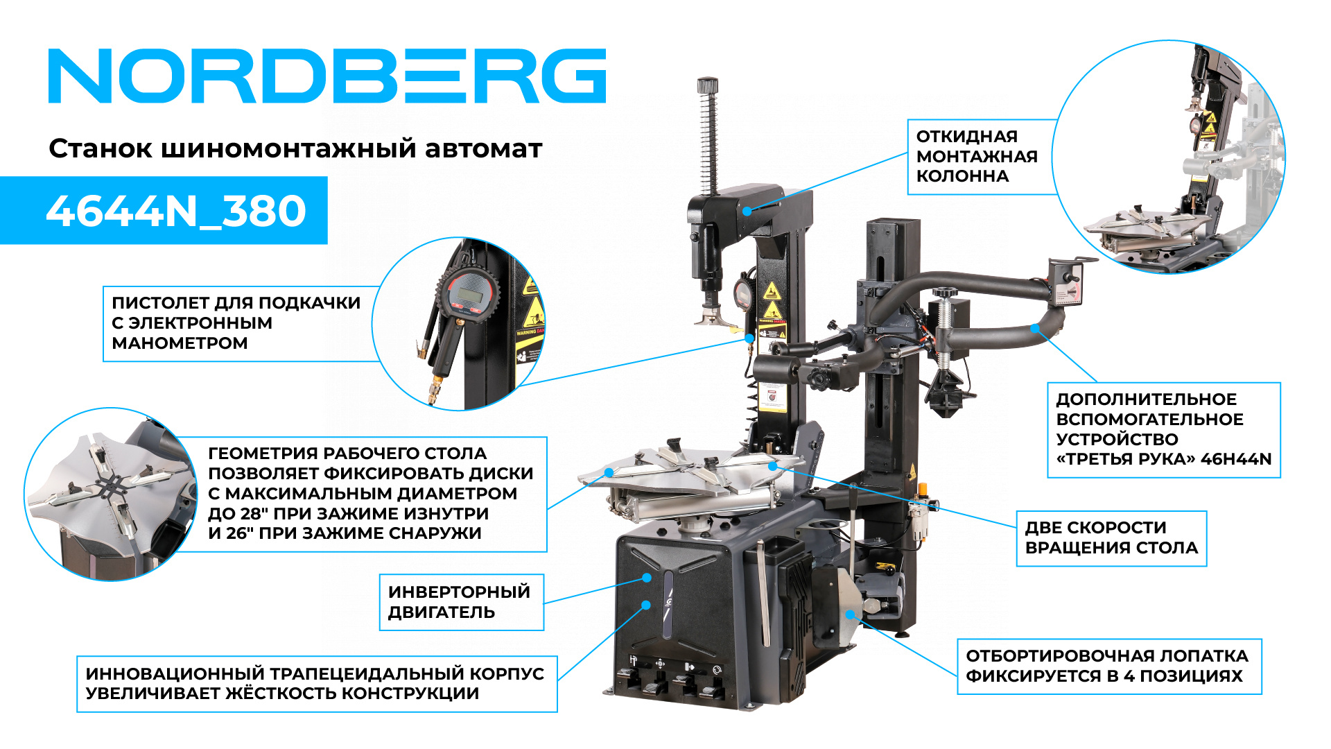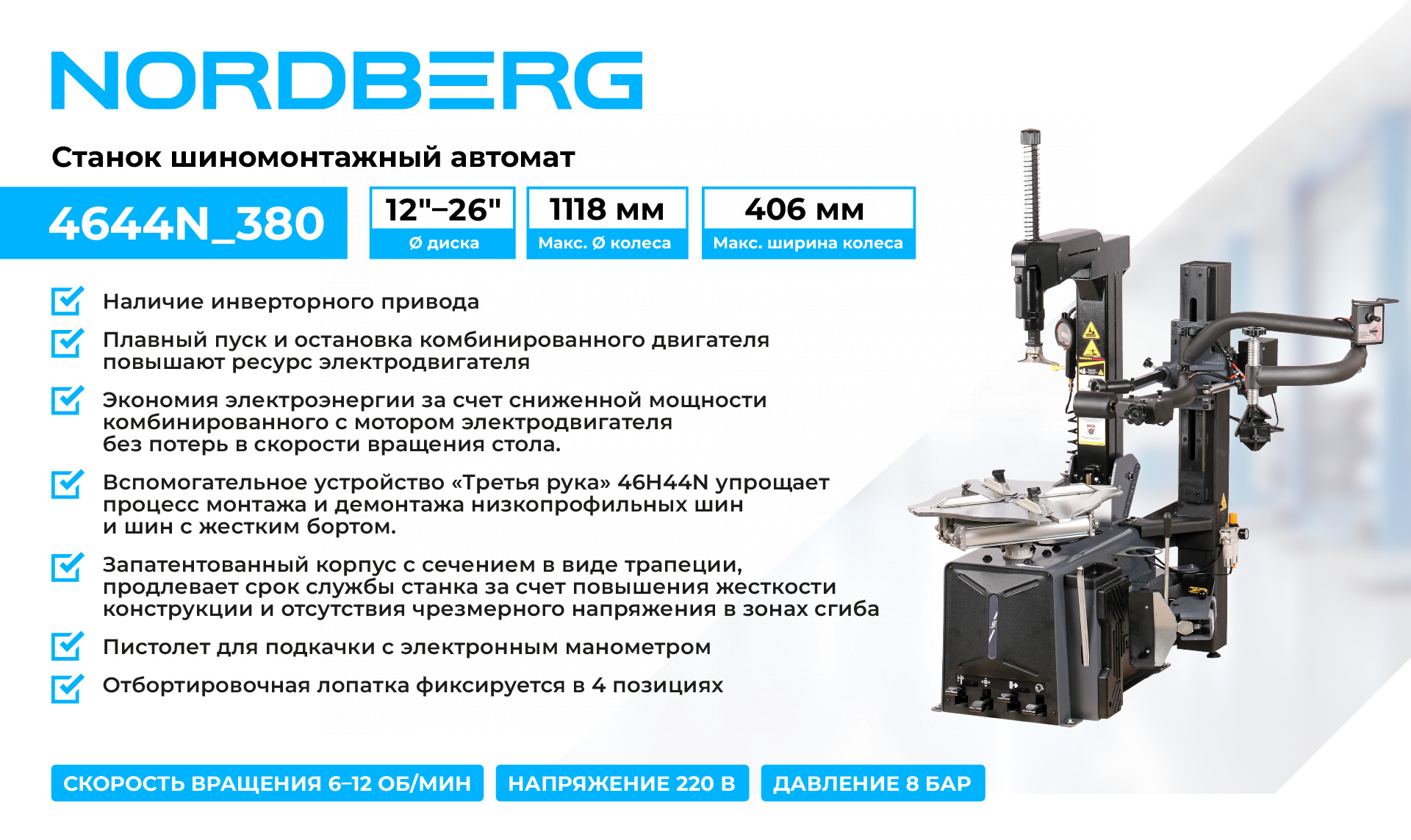 Надежный шиномонтажный двухскоростной автоматический станок NORDBERG 4644N позволит проводить шиномонтажные работы с максимальной производительностью, быстротой и безопасностью.