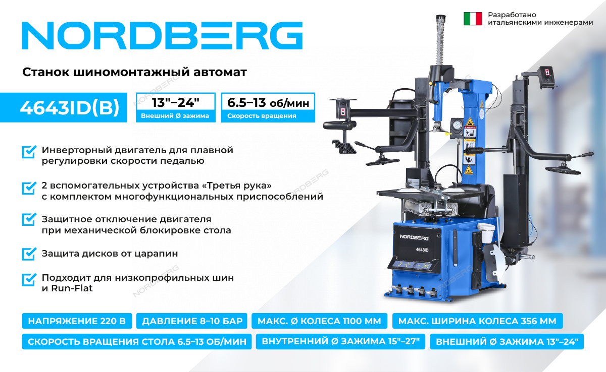 Шиномонтажный автоматический станок NORDBERG 4643ID увеличивает скорость и повышает точность работы оператора.