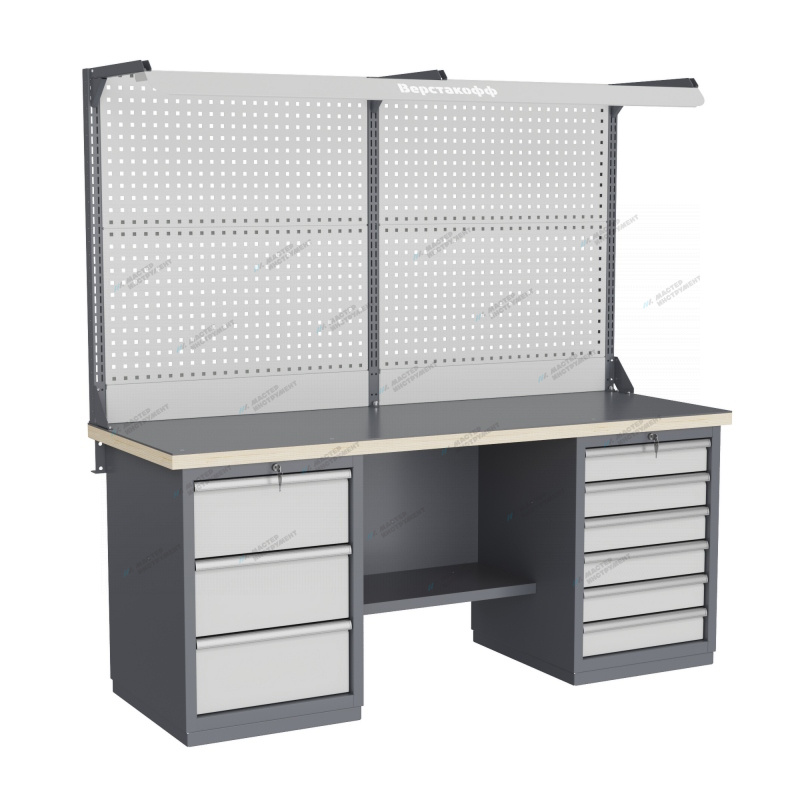 Верстак может комплектоваться одинарным или двойным перфорированным экраном, электромонтажным блоком для установки розеток и дополнительных устройств, а также комплектом освещения с держателем и лампой. Перфорация экрана подходит под стандартные держатели для инструментов, отверток, крючков, полок. Возможна комплектование верстака навесным элементами (держатели, крючки, полки).