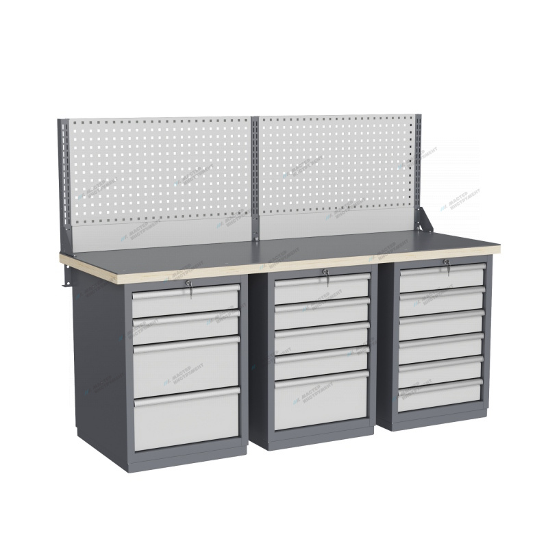 Тумбы и опоры верстаков выполнены из профилированной холоднокатаной стали и имеют сварную конструкцию. Возможна установка любых сочетаний тумб с различным количеством выдвижных ящиков, а также с дверцей и полками. Между тумбами и опорами возможна установка полки-стенки. На каждой ручке ящика и двери закреплен специальный алюминиевый профиль с отделением для установки маркировки. На тумбы с выдвижными ящиками установлена система антиопрокидывания, которая ограничивает выдвижение остальных ящиков тумбы, если один из ящиков выдвинут. Ящики снабжены специальными усиленными шариковыми направляющими. Тумбы снабжены центральной системой запирания.