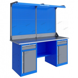 Верстак представляет собой сборно-разборную конструкцию. Верстак комплектуется полкой-стенкой, расположенной под столешницей для удобного размещения габаритного инструмента и оснастки. Все металлические элементы покрыты полиэфирной порошковой краской, обеспечивающей хорошую износостойкость покрытия и невосприимчивость его к моющим средствам и смазочным веществам. Цвет и текстура покрытия корпуса тумб, опор, полки-стенки, экранов и комплектов освещения RAL 5015, гладкая, полуматовая. Цвет и текстура покрытия ящиков и дверок верстака, кронштейнов экранов и косынок RAL 7037, гладкая, глянцевая. Цвет и текстура покрытия накладок ручек ящиков и дверок RAL 9006, гладкая, глянцевая. Столешница состоит из листа влагостойкой фанеры марки ФСФ толщиной 24 мм, которая покрыта лаком-антисептиком и листом оцинкованной холоднокатаной стали толщиной 1,2 мм. Глубина столешниц 696 мм. Максимальная масса груза, равномерно распределенного по столешнице - 1000 кг. Тумбы верстаков выполнены сварными. Ящики в тумбах устанавливаются на шариковых телескопических направляющих полного выдвижения. В тумбе P8 установлен малый ящик и имеется отделение с дверью и одной полкой. Внутренние размеры малых ящиков (ВхШхГ), не более: 103 х 397 х 520 мм. Ящик снабжен центральным замком с поворотом ригеля 180 градусов и подпружиненной тягой. Полка устанавливается на парах специальных формованных зацепов, выполненных в боковых стенках тумбы. Имеется возможность смены стороны открывания двери. Дверь тумбы снабжена центральным замком с поворотом ригеля 180 градусов. В комплекте имеется два ключа с каждым замком. Максимально допустимая масса груза, равномерно распределенного по поверхности любого выдвижного ящика 30 кг (при установке в большой ящик двух пар направляющих 50 кг). Максимальная масса груза, распределенного по поверхности полки и полки стенки - 30 кг. Верстак имеет декларацию соответствия ТР ТС 025/2012 «О безопасности мебельной продукции». Верстак имеет сертификат соответствия ГОСТ Р 58863-2020 «Столы производственные. Верстаки из металла. Общие технические условия». Двойной экран (перфорированные панели) верстака выполнен с квадратной перфорацией 12х12 мм с шагом 38 мм для установки крючков, держателей и других аксессуаров. Экран крепится к столешнице с помощью специальных кронштейнов. Максимальная масса груза, равномерно распределенного по поверхности экрана - 21 кг. Комплект освещения устанавливается над верстаком. В комплекте идет защитный козырек, кронштейны и лампа с магнитными креплениями, которые позволяют менять ее положение.